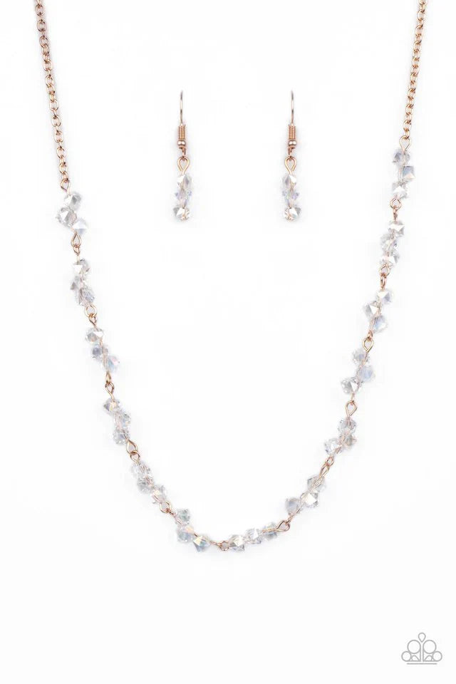 Attached to a dainty rose gold chain, trios of iridescent crystal-like beads are delicately threaded along rose gold rods below the collar for a timelessly twinkly look. Features an adjustable clasp closure.
